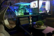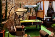 יש מיטת שיזוף בגינה, במתחם מטבח חיצוני משותף, נדנדה לגינה, דשא במתחם, ברביקיו, סוככי שמש, יש תאורה, רהיטי גן מפנקים, יש שימשיות, עצים, צמחי נוי צבעוניים, בגינה תלוי ערסל, פינת ישיבה לנופשים. |