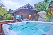 בחצר המתחם ג'קוזי ספא פרטי לכל בקתה, פינת מנגל, פינת ישיבה, שולחן וכסאות, תאורת גן, רחבת דק.