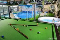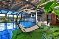 בריכה שיש ממנה נוף, בריכה מקורה חלומית ומחוממת, בריכה עם חימום פנימי, יש מיטת שיזוף בגינה, שולחן ביליארד למשחק, בגינה תלוי ערסל, דשא במתחם, ברביקיו, סוככי שמש, יש תאורה, פינת ישיבה לנופשים שיש ממנה נוף, פינת ישיבה לנופשים, רהיטי גן מפנקים, עצים, צמחי נוי צבעוניים. |